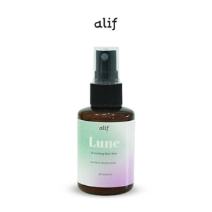 Alif Lune Hair Mist memiliki kandungan Almond Oil, Sunflower Oil, Olive Oil, Menthol dan Nicotinamide (Pro Vit B3). Kemasan edisi 60ml.